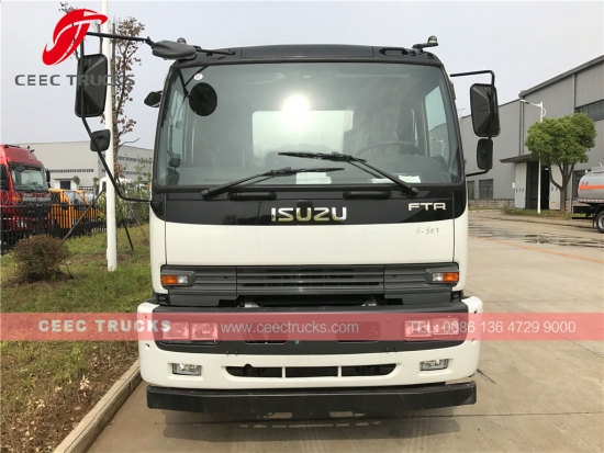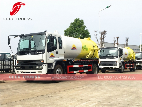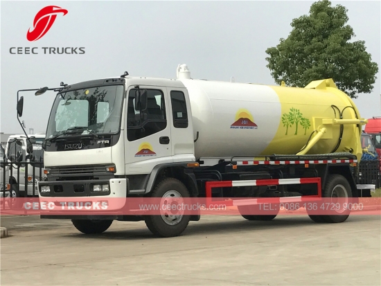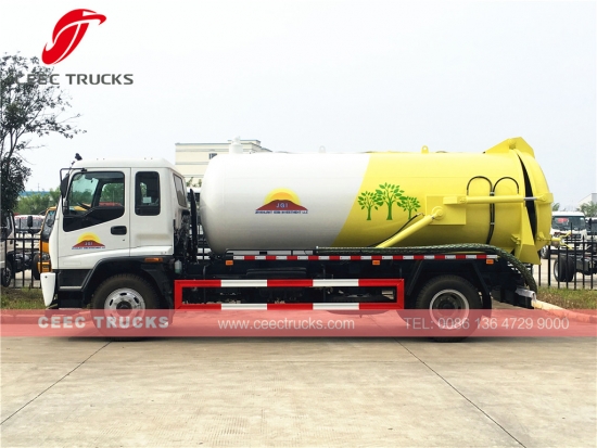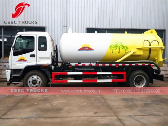 ISUZU brand 10000L cesspit emptier, ISUZU 4HK1-TC 190HP diesel engine, isuzu MLD 6-shift manual gearbox, high strength steel material tanker ay maaaring hanggang 10 cbm, WEILONG vacuum pump, hydraulic lifting device para sa paglabas ng basura, pagpipinta at mga logo ay depende sa kahilingan.