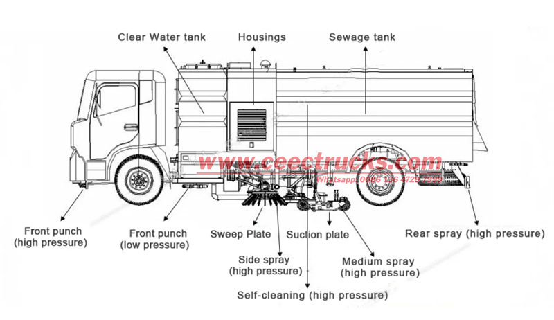 ● Nagtatampok ang superstructure ng street sweeper truck ng isang compact na disenyo at isang streamlined na layout, na tinitiyak ang matatag na operasyon at pagpapahaba ng buhay ng serbisyo ng sasakyan.