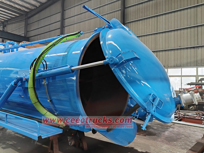 Ang sistema ng vacuum, na kinabibilangan ng isang vacuum pump at isang oil-gas separator, ay gumagamit ng negatibong presyon upang kunin ang basura. Ang tank assembly ay gawa sa mataas na lakas, corrosion-resistant steel at nagtatampok ng inspection window at feed port para sa wastewater storage. Ang sistema ng piping, kabilang ang mga suction at discharge pipe at isang control valve, ay responsable para sa paglipat ng media. Ang truck mounted vacuum tanker unit itinataas ng hydraulic system ang tangke at binubuksan ang takip sa likuran, na nagpapadali sa paglabas ng wastewater. Ang operating platform ay nilagyan ng mga control button at isang pressure gauge para sa real-time na pagsubaybay.