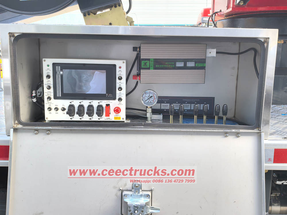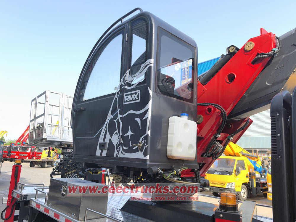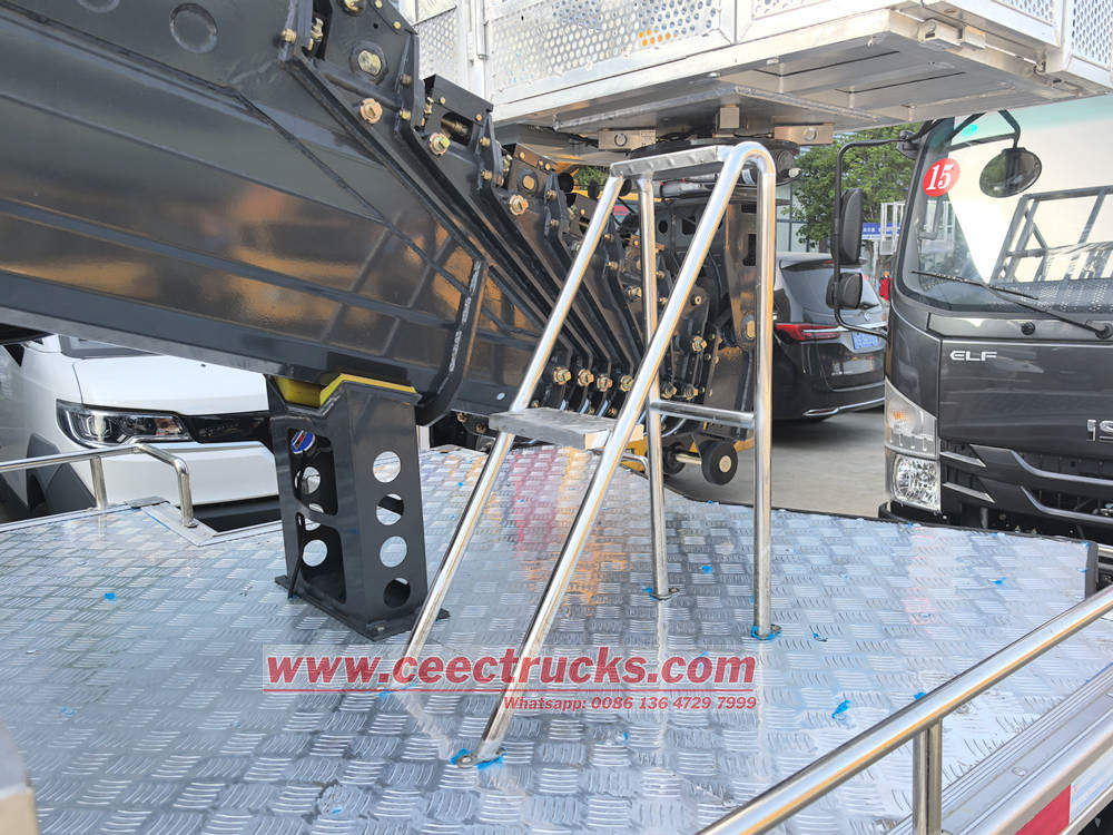 Ang Isuzu KV100 aerial work platform truck ay gumagamit ng isang multi-section na telescopic arm na disenyo na may malaking extension angle at flexible na operasyon, at madaling maabot ang mga taas na mahirap abutin ng ordinaryong kagamitan. Ang operating system sa platform ay simple at malinaw, nilagyan ng maraming operating mode tulad ng electrical operation, ground remote control, in-basket controller at emergency operating lever, na tinitiyak ang kaligtasan at kahusayan ng mga operator.