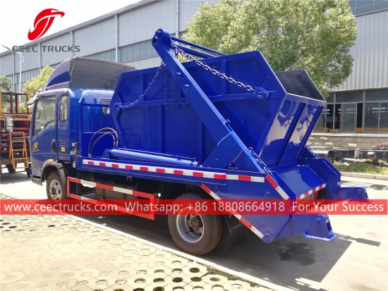 HOWO 6cbm skip loader garbage truck, HOWO 4x2 chassis, Manual 6-shift manual gearbox, 120HP diesel engine, high strength steel swing arm system, Hydraulic control device at Electric control box opsyonal. Lahat Ang pagpipinta at mga logo ay nakadepende sa kinakailangan.