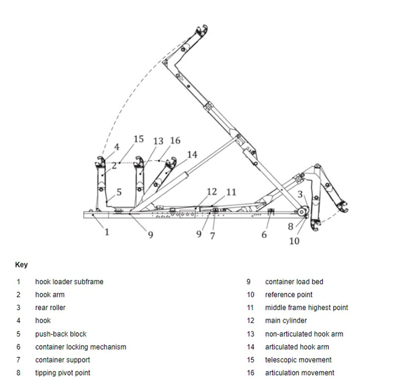 Ang operating cycle ay gumagana tulad nito: Sa panahon ng paglo-load, ang hook arm ay nakakabit sa front hook ng lalagyan ng basura, at hinihila ng hydraulic system ang lalagyan ng maayos papunta sa frame at sinigurado ito. Sa panahon ng pagbabawas, dahan-dahang itinutulak ng hook arm ang lalagyan mula sa frame, na naghihiwalay dito sa chassis para sa madaling pag-recycle.