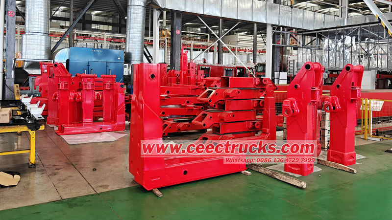 ● Ang pang-itaas na istraktura ng arm roll hook loader ay gumagamit ng naka-link na hook arm at hydraulic cylinder na disenyo, na hydraulic na pinapagana ang buong proseso ng hooking, lifting, unloading, at paglalagay ng carriage.