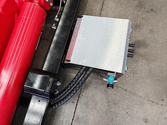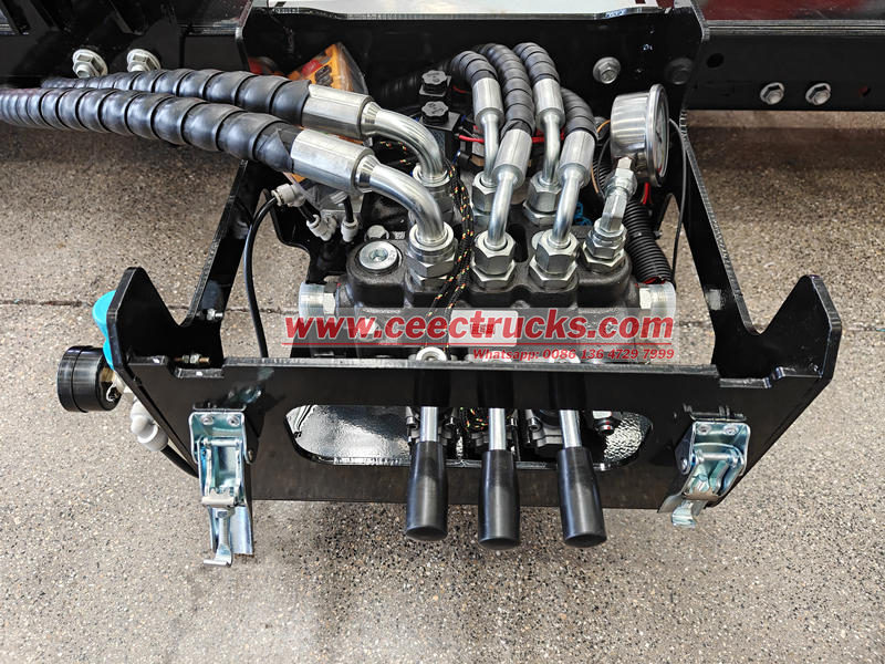 Ang high-pressure na langis na ito ay inihahatid sa pamamagitan ng mga hydraulic na linya patungo sa mga hydraulic cylinder, na nagtutulak sa extension ng hook arm, pag-ikot, at pag-angat/pagbaba ng mga galaw, habang kinokontrol din ang pagbubukas at pagsasara ng mekanismo ng pagsasara upang i-hook, iangat, at i-secure ang basurahan. Ang buong proseso ay tiyak na kinokontrol ng hydraulic system, na tinitiyak ang maayos at tuluy-tuloy na paggalaw.
