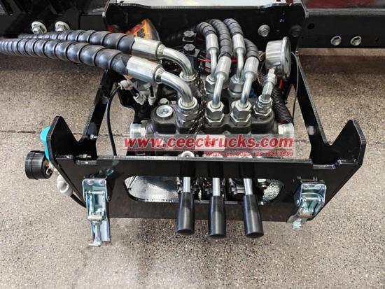 Prinsipyo ng Power Transmission at Actuation: Ang pang-itaas na istraktura ng arm roll hook loader ay gumagamit ng makina ng sasakyan bilang pinagmumulan ng kuryente nito, na nagpapadala ng kapangyarihan sa isang hydraulic pump sa pamamagitan ng power take-off. Ang hydraulic pump ay nagko-convert ng mekanikal na enerhiya sa haydroliko na enerhiya, na bumubuo ng mataas na presyon ng langis.