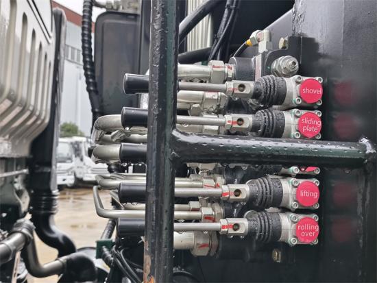 Ang trak ng basura ay gumagamit ng electro-hydraulic control valve at PLC programmable control system, na komprehensibong gumagamit ng mga bentahe ng electric control at hydraulic control. Sa pamamagitan ng electric-hydraulic combined control, epektibo nitong nalulutas ang problema sa interface sa pagitan ng hydraulic system at ng electrical system at pinapabuti ang pagiging maaasahan ng paggamit.