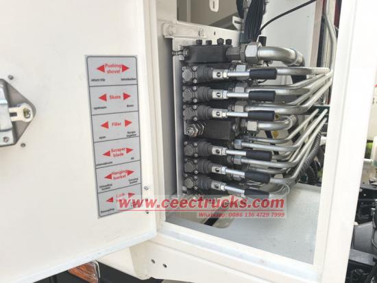 ● Ang scraper ay pumipitik at siksik sa basura at gumagalaw pataas. Itinutulak ng push shovel ang basura sa likuran ng compartment sa ilalim ng hydraulic drive upang bumuo ng pangalawang compression.