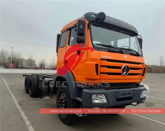 Beiben 2642 cargo truck chassis 6*6 drive, military quality assurance, sikat na brand weichai 420 hp diesel engine,12JS200T sobrang maaasahang transmission, 4450+1450 mm wheelbase, heavy duty reinforced 4 u-bolt suspension system, Mercedes Benzar technology front axle at rear axle, benz technology NG80B cabin.