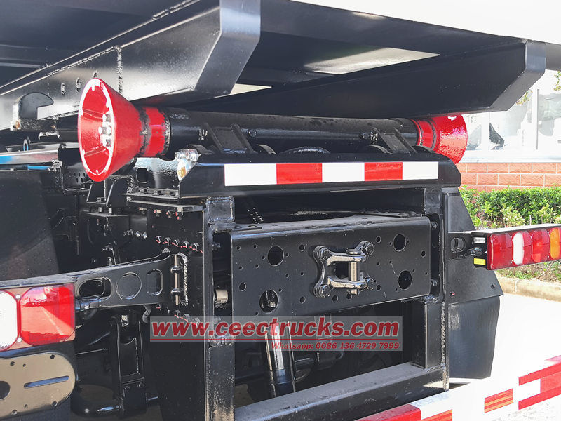 Ang trak ay nilagyan ng 11 12.00R20 na gulong, na nagbibigay ng mas mataas na kapasidad ng pagkarga at kakayahang umangkop sa iba't ibang kondisyon ng kalsada. Nagtatampok ang trak ng hiwalay na katawan at chassis, na may hydraulic hook arm sa likuran, na nagbibigay-daan sa mabilis na pagkarga, pagbabawas, at paglipat ng mga basurahan.