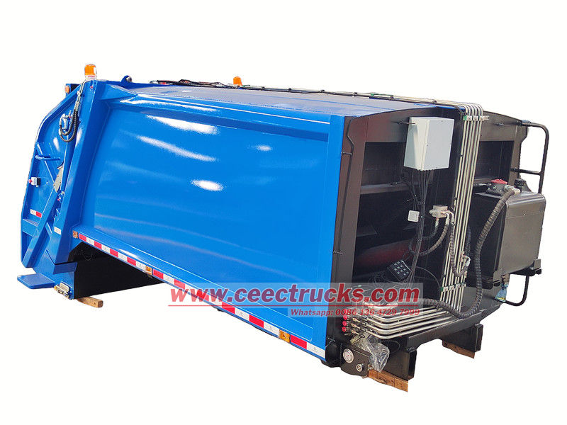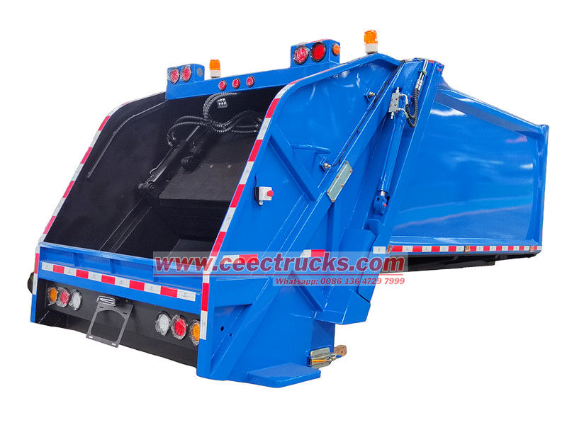 Ang 10 CBM rear loader refuse body ay binubuo ng isang selyadong compartment, isang pusher blade, isang loader, isang hydraulic system, at isang electronic control system. Ang kompartimento ay gumagamit ng mga reinforced beam na hinangin sa bakal na mga plato, na may mga panloob na slideway para sa pusher blade na dumulas at mag-alis. Kinokontrol ng hydraulic system ang paggalaw ng bawat cylinder, habang ang electronic control system ay nagbibigay-daan sa awtomatikong operasyon, tinitiyak ang mahusay at selyadong operasyon sa buong proseso ng pagkolekta ng basura, compression, at transportasyon, na pumipigil sa pangalawang kontaminasyon.