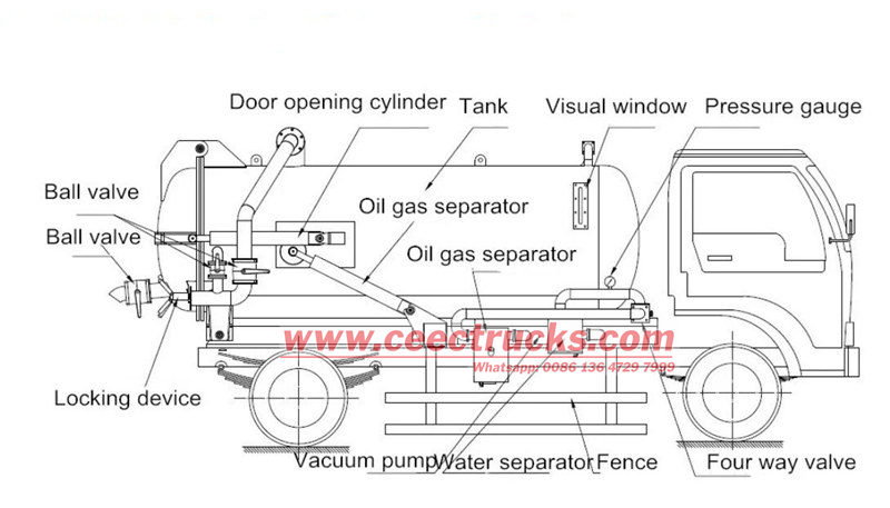 Ang tuktok na bahagi ay nilagyan ng imported na vacuum pump (customizable brand) na nag-aalok ng malakas na kapasidad ng pagsipsip, na nagbibigay-daan sa mabilis na pagkuha at paglipat ng wastewater, slurry, at sediment. Ang hydraulic system ay nagbibigay-daan para sa pag-angat ng tangke at pagbubukas ng likurang takip, pagtitipid ng oras at pagsisikap sa panahon ng pagbabawas at makabuluhang pagpapabuti ng kahusayan sa pagpapatakbo.