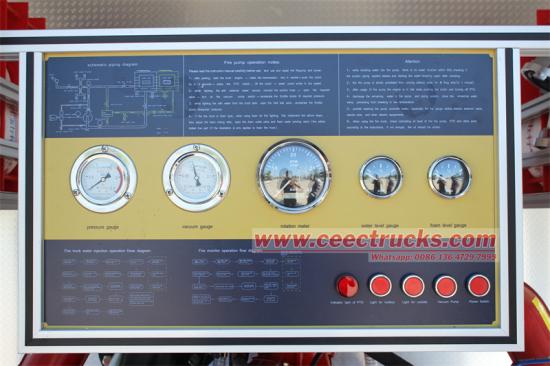 ●Control panel:integrated tachometer (sinusubaybayan ang bilis ng engine), vacuum gauge (nakikita ang pump vacuum), pressure gauge (ipinapakita ang presyon ng tubig sa totoong oras), foam level gauge (ipinapakita ang natitirang dami ng foam liquid), water level gauge (ipinapakita ang antas ng tubig ng tangke ng tubig).