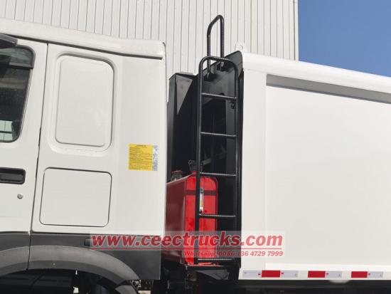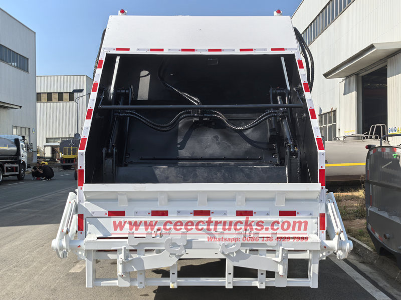 Rear tilting device for 770L and 1100L binsAng HOWO 14cbm rear loader compactor truck ay isang pangunahing kagamitan para sa urban sanitation, na pinagsasama ang mga electromechanical at hydraulic na teknolohiya. Sa panahon ng operasyon, ang hydraulic system ay nagtutulak sa push shovel upang malakas na i-compress ang basura, lubos na binabawasan ang dami ng basura at pinapataas ang solong dami ng transportasyon. Ang ganap na nakapaloob na kompartimento at kagamitan sa pagkolekta ng dumi sa alkantarilya ay epektibong pinipigilan ang pagtagas ng dumi sa alkantarilya at pagkalat ng basura sa panahon ng transportasyon, pag-iwas sa pangalawang polusyon. Kasabay nito, HOWO rear loader compactor truck ay nilagyan ng isang matalinong operating system, sumusuporta sa maramihang mga paraan ng pangongolekta ng basura, at maginhawa at mahusay na gumana.