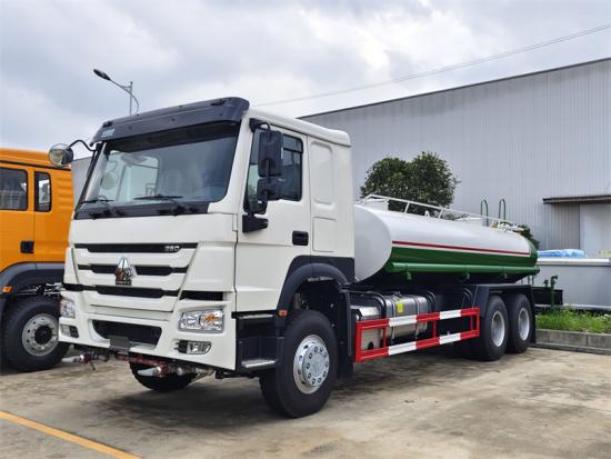 HOWO HW76, NX cabin is optionalAng HOWO 6×4 Water Truck ay isang multi-functional green sanitation vehicle na binago sa SINOTRUK HOWO ZZ1257 6×4 drive chassis. Nilagyan ito ng 20,000L carbon steel water tank, isang 80QZ60/90-type na water pump, at isang sprinkler system. Gumagana ang sasakyan sa pamamagitan ng paggamit ng onboard pump nito sa self-prime water mula sa mga panlabas na pinagmumulan at pagkatapos ay dinadala ito sa ilalim ng presyon sa mga sprinkler sa harap/likod/ gilid at isang water cannon na may saklaw na ≥35 metro, na nagpapagana ng iba't ibang mga mode ng pag-spray.