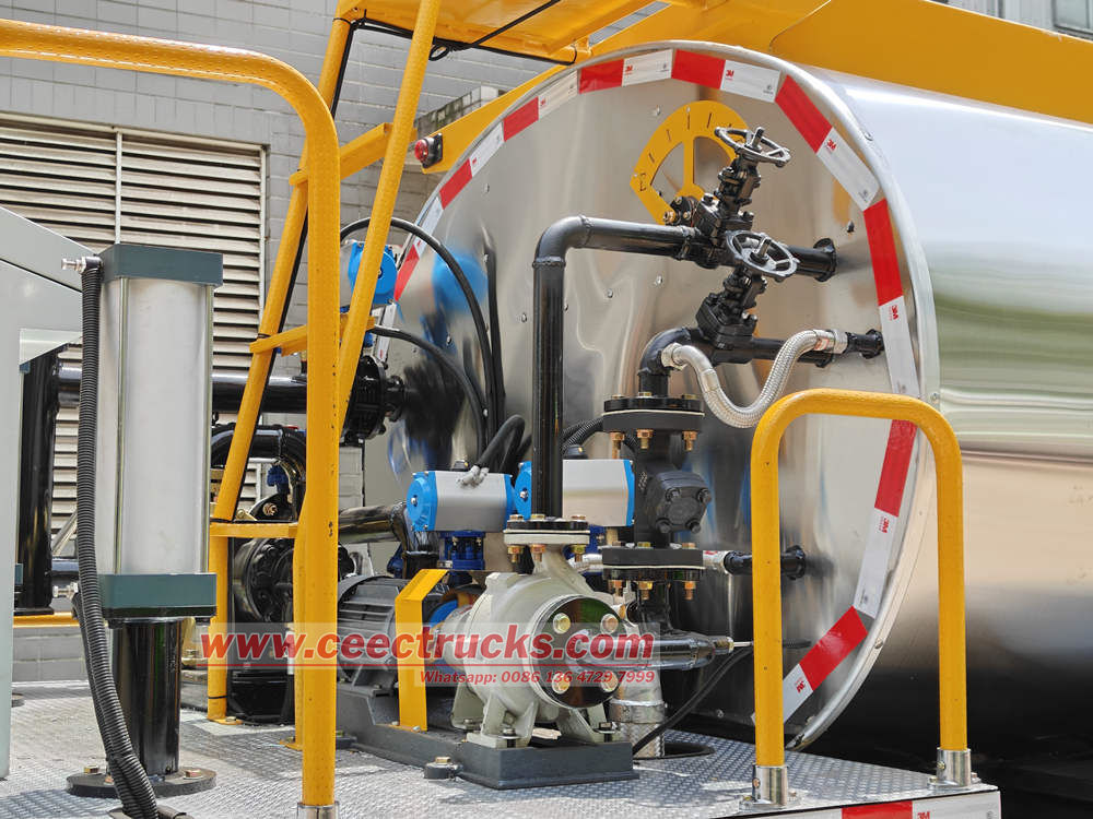 Kapag nagtatrabaho, dinadala ng asphalt pump ang aspalto sa tangke patungo sa sistema ng pag-init, at gumagamit ng fuel burner o thermal oil upang painitin ito sa isang umaagos na estado. Ang pinainit na aspalto ay dinadala sa spreader sa pamamagitan ng isang pipeline, at sa tulong ng teknolohiya ng pag-spray, ito ay pantay na na-spray sa ibabaw ng kalsada sa pamamagitan ng nozzle.