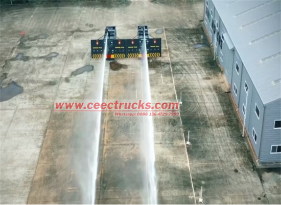 ● Full vehicle high pressure spray: 6 na grupo ng high pressure foam nozzle ang nakaayos sa bubong at 4 na grupo ng high pressure foam nozzle ay nakaayos sa chassis, na may gumaganang pressure na 1.2MPa at isang solong nozzle flow rate na 15L/min, na sumasaklaw sa fire extinguishing blind area ngang buong sasakyan sa loob ng 30 segundo.