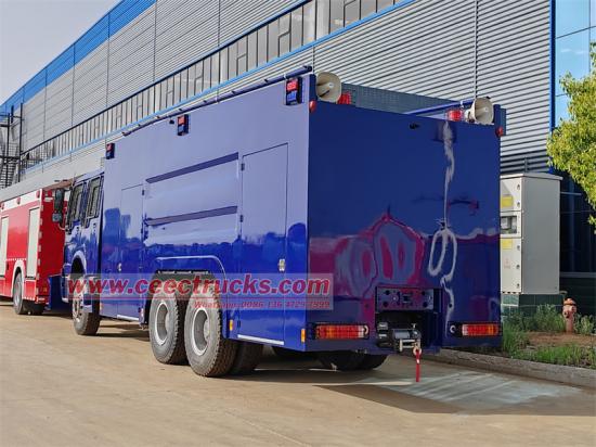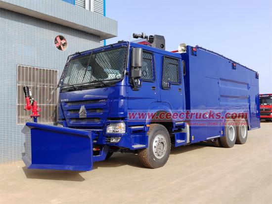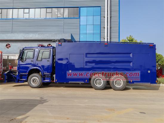 Ang HOWO 6x4 explosion-proof na water cannon truck ay binago batay sa HOWO HW76 double-row cab chassis, na may wheelbase na 4600+1350mm, nilagyan ng WP10H400E60 engine at HW15710 gearbox. Ang sasakyan ay nilagyan ng isang explosion-proof box, isang pangunahing baril sa itaas at isang front water auxiliary gun sa ulo, na maaaring makamit ang all-round, large-flow at long-distance riot control; double-row cab, 6 na pasahero; kabilang ang Water tanker: 12000L, Foam tanker: 100L, Dye tanker: 100L, Pepper water tank: 100L, nilagyan ng CB10/60 fire pump, ang harap ng sasakyan ay nilagyan ng riot-proof steel plate at strong hydraulic obstacle clearing steel shovel; ang mga lamp at salamin sa bintana ay protektado ng hindi kinakalawang na asero mesh.