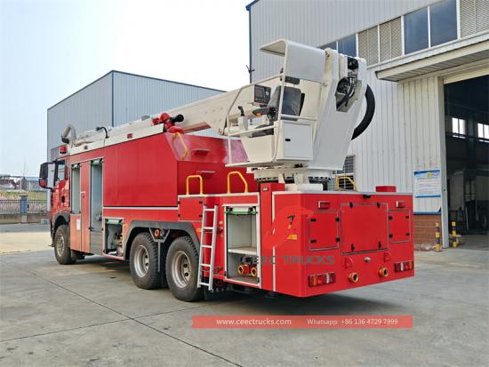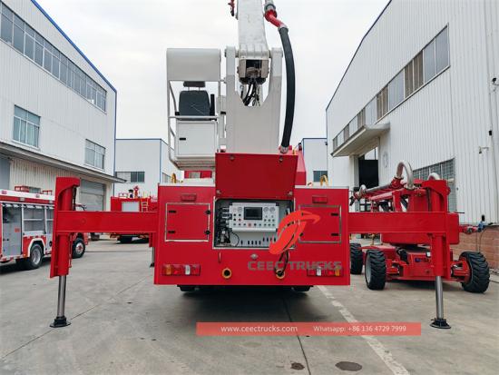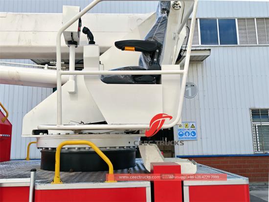 1) Ang Howo water at foam na may naka-mount na high reach extendable turret ay may function ng high spray fire extinguishing, ang outrigger at boom movement speed ay stable at mabilis, at mas mabilis na maabot ang working state.