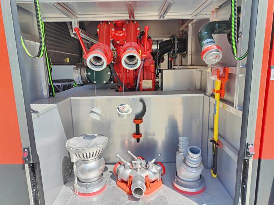 High-Performance Fire Pump– Nagtatampok ng CB10/80 fire pump na may 4,800 L/min na output sa 10 bar, na tinitiyak ang malakas at maaasahang tubig/foam discharge. Opsyonal na maging Darley at HALE brand fire pump