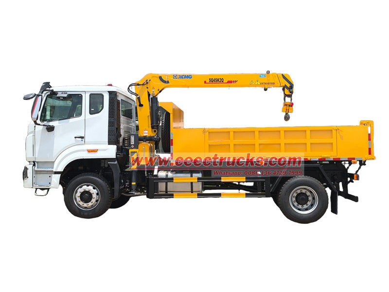 Ang HOWO single axle 4ton truck mounted crane ay angkop para sa mga aplikasyon sa konstruksiyon, logistik, imprastraktura, pagmimina at iba pang larangan. Ang sasakyan ay binago sa HOWO chassis, wheelbase na 4600mm. Nilagyan ito ng WEICHAI WP10.300E22 300HP engine at isang HW13710 10-speed gearbox. Ang itaas na bahagi ay isang 3800×2400×450mm cargo box at isang XCMG SQ4SK2Q crane, na kayang magbuhat ng 4 na tonelada. Ang kreyn ay maaaring paandarin ng mga manual hydraulic levers sa magkabilang panig upang makontrol ang pagbawi at pagpapalawig ng mga outrigger at ang pagbawi at pag-ikot ng kreyn.