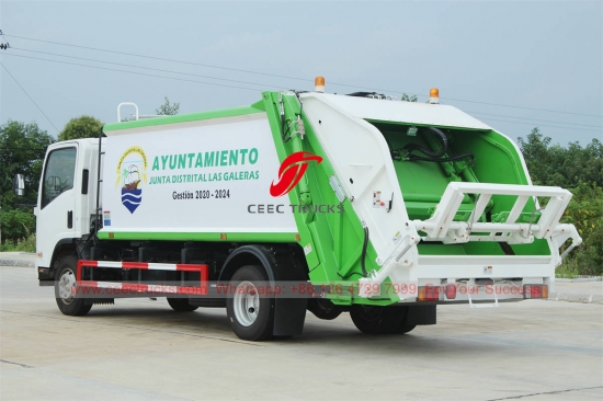 ISUZU 10CBM Back Loading garbage truck (tinatawag ding ISUZU garbage compactor, back loading bin truck, ISUZU waste disposal truck, rear loader refuse truck, rubbish compactor truck, garbage compactor manufacturer) ay idinisenyo para sa pang-araw-araw na transportasyon ng basura sa mga lugar na tirahan gaya ng lahat ng uri ng lungsod, malaking istasyon, daungan at pantalan, paliparan, at makapal ang populasyon mga lugar tulad ng mga pang-industriya at mineral na negosyo at mga yunit ng militar.