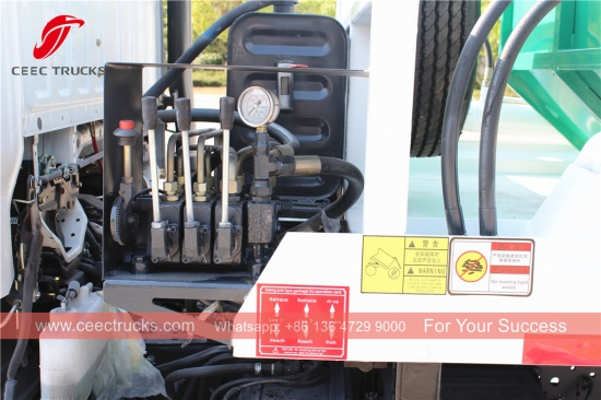 Mongolia ISUZU 4cbm skip refuse garbage truck, ISUZU 4x2 chassis, MSB 5-shift manual gearbox, 98HP diesel engine, high strength steel swing arm system, Hydraulic control device at Electric control box opsyonal, Ang lahat ng pagpipinta at logo ay nakadepende sa kinakailangan.