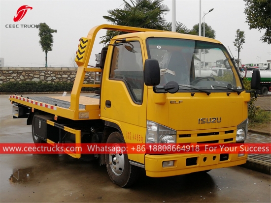 ISUZU road wrecker truck, ISUZU 4x2 chassis, manual 5-shift manual gearbox, ISUZU 115HP diesel engine, mahabang platform na may hydraulic cylinder na gumagana, Ang pagpipinta at mga logo ay nakadepende sa kinakailangan.