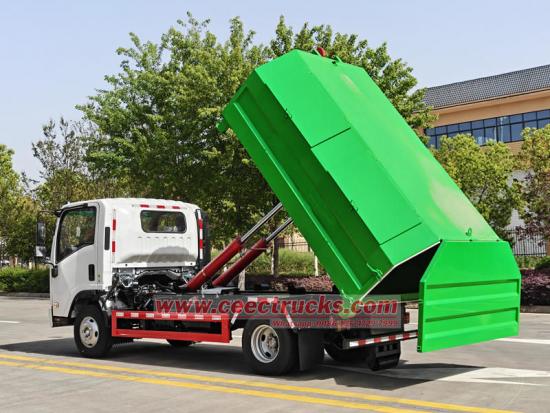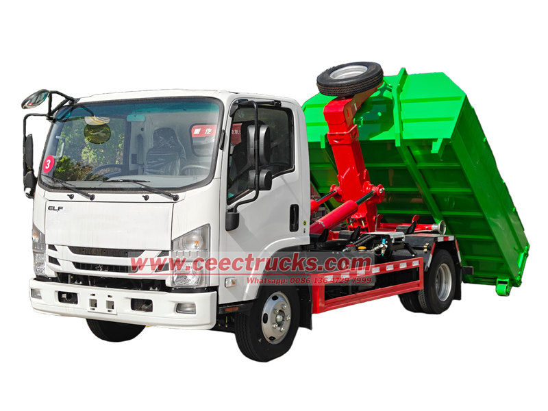 Isuzu 5ton roro hook lift truck tinatawag din Isuzu ELF swing arm garbage truck, Isuzu NPR hook lifting truck, Isuzu hook loader, Isuzu 190hp hook arm garbage truck, Isuzu ELF roll on roll off truck, Isuzu 6 wheels hook loader truck, at iba pa. Ang sasakyan ay binago sa Isuzu ELF chassis, 3360mm wheelbase, nilagyan ng malakas na Isuzu 4HK1-TCG61 diesel engine at Isuzu MLD 6-speed gearbox, malakas, maayos na paglilipat, tinitiyak ang mahusay na pagganap sa pagmamaneho at katatagan ng pagpapatakbo.