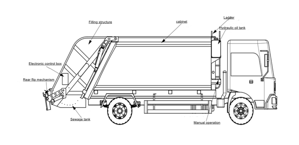 Ang itaas na istraktura ay nagtatampok ng isang 10-cubic-meter carbon steel na naka-compress na basura ng tangke na may 4mm side kapal at 5mm sa ilalim ng kapal, na kung saan ay matibay at may malaking kapasidad Ang curved compactor body ay nilagyan ng pinakamataas na kalidad na tatak ng Tsino na Hefei wanye hydraulic cylinders upang matiyak ang malakas at maaasahang compression