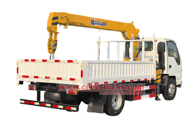 Isuzu ELF 3.2ton truck loader crane na tinatawag ding Isuzu ELF truck na may 3.2 Ton crane lift, telescopic crane truck, service boom truck, telescopic boom truck mounted crane, atbp. Ang sasakyan ay binago sa Isuzu 100P chassis, nilagyan ng Isuzu 4KH1CN6LB 120HP engine, malakas, katugma ng MSB 5-speed transmission, smooth shifting, at isang SQS-68 crane sa likuran ng katawan ng sasakyan, na may malaking lifting capacity at reach, at isang 3000x2100x4 na kahon na madaling buhatin ang carx4. crane hook.