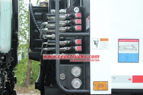 —— Sistema ng Chassis: Isuzu GigaAng trak ng compactor ng basura, na nilagyan ng espesyal na makina ng ISUZU 6uz1modelo, 380 horsepower engine, gearbox (tulad ng Mabilis12-speed gearbox) at drive system, sumusuporta sa pambansang pamantayan sa paglabas ng V/National VI Kasama sa pagsasaayos ng chassis ang air preno, abs, orihinal na air conditioning, remote control key, upang matiyak ang katatagan ng pagmamaneho at maginhawang operasyon