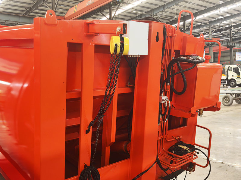 Ang rear loading garbage compactor upper body kit ay ginawa mula sa welded high-strength steel plates, na lumilikha ng matibay, matibay na istraktura na may mahusay na sealing, na epektibong pumipigil sa pagtagas ng wastewater at pagtagas ng amoy. Ang interior ay ginagamot ng corrosion at rust prevention, at nilagyan ng high-efficiency compression mechanism, na makabuluhang binabawasan ang dami ng basura at pagpapabuti ng loading efficiency. Ang itaas na bahagi ng katawan ay may kapasidad na 8 cbm at sumusuporta sa maraming paraan ng paglo-load at pagbabawas upang matugunan ang magkakaibang mga pangangailangan sa pagpapatakbo.